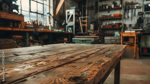 © Alex, Fototapeta premium Cozy Repair Shop Interior with Wooden Table Generative AI