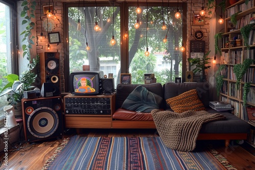 Naklejka premium Cozy retro living room with vintage decor and string lights