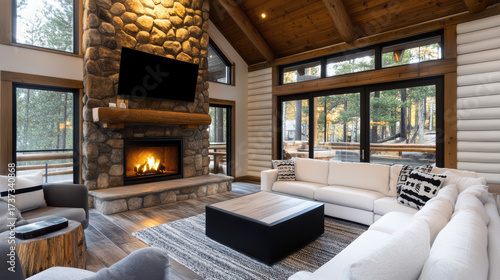 Naklejka premium Cozy rustic cabin interior featuring stone fireplace, warm ambiance, and modern furnishings