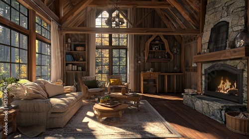 Fototapeta premium Cozy rustic cabin interior with fireplace and large windows overlooking fall...