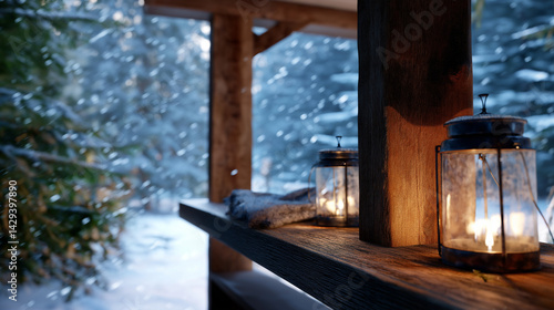 Obraz premium Cozy rustic cabin porch in snowy winter forest