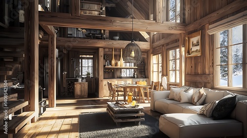 Naklejka premium Cozy Rustic Living Room with Wooden Decor and Natural Light