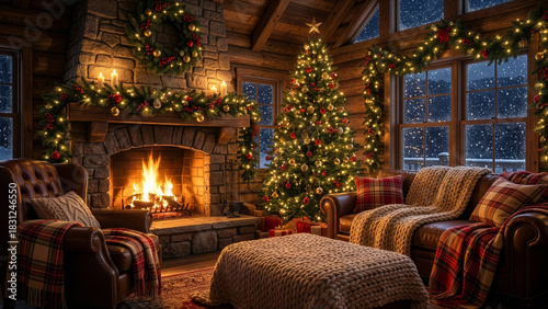 © Designbrisa, Fototapeta premium Cozy Rustic Log Cabin Living Room with Stone Fireplace, Decorated Christmas Tree, and Snowy Night View