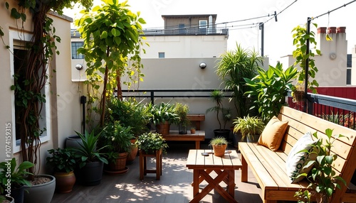 © Asad, Fototapeta premium Cozy Seating Area Surrounded by Lush Greenery on Rooftop Garden