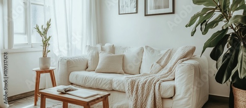 Fototapeta premium Cozy small living room with bright white decor and inviting atmosphere...