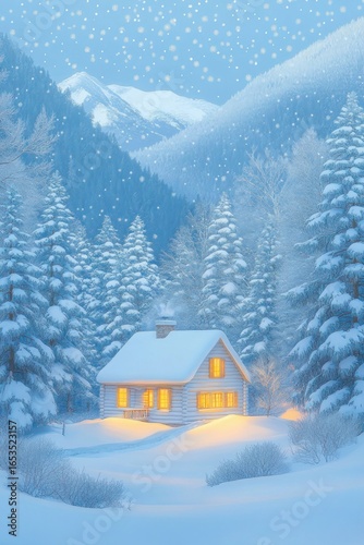 Fototapeta premium Cozy snow-covered log cabin with glowing warm lights nestled among tall...