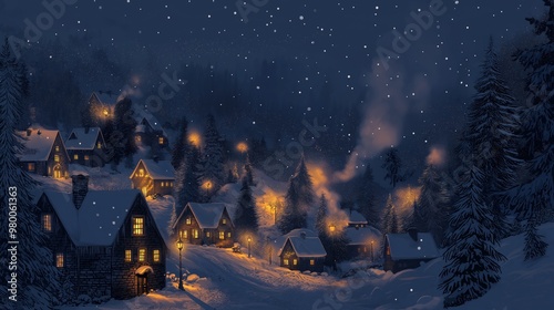 © TatChong, Naklejka premium Cozy Snow Covered Village at Night