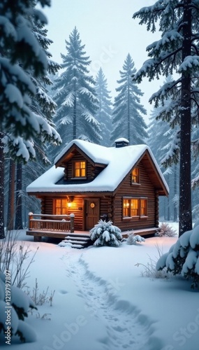 Naklejka premium Cozy snow covered wooden cabin nestled in pine trees, forest atmosphere, warm...