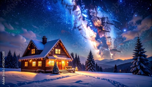 Naklejka premium Cozy snowy cabin, starry night