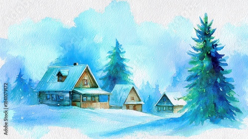 Naklejka premium Cozy Snowy Village Scene with Evergreen Trees and Traditional Houses in Winter
