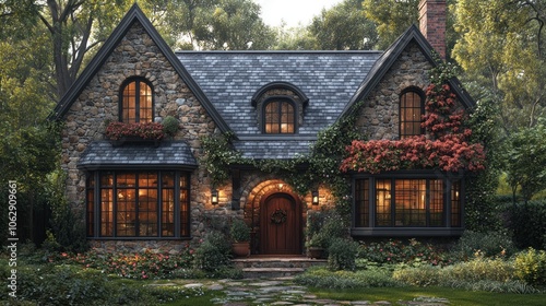 © Sujito, Obraz premium Cozy stone house surrounded by lush greenery and flowers.