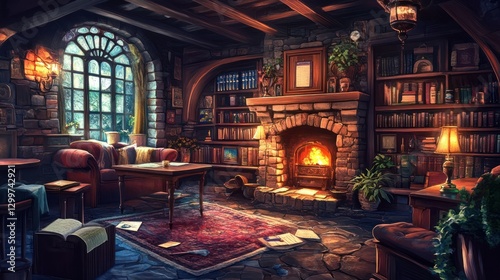 © nara, Naklejka premium Cozy stone library, firelit, reading