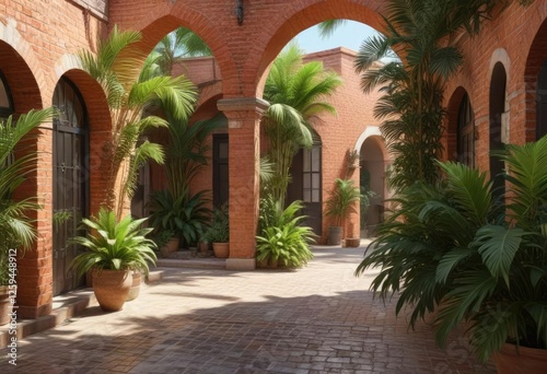 © Phetthanousack, Fototapeta premium Cozy summer afternoon in a sun-drenched courtyard with arching palm leaves and exposed brick, peaceful, arching palm trees