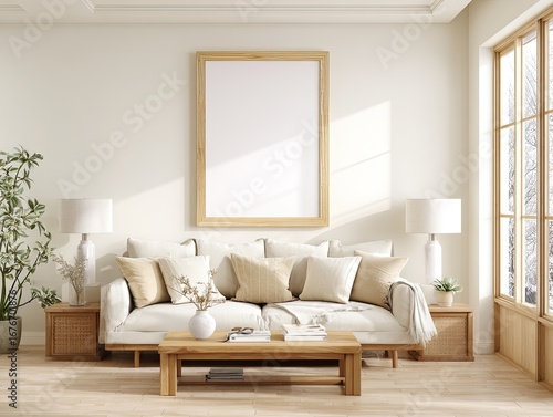 Fototapeta premium Cozy, sun-drenched living room with a blank framed canvas