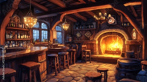 Obraz premium Cozy Tavern Interior with a Warm Fireplace and Wooden Bar