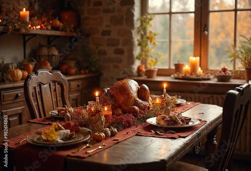 Fototapeta premium Cozy Thanksgiving dinner table setup with roasted turkey centerpiece.