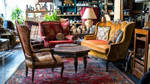 Naklejka premium Cozy vintage living room with antique armchairs and sofa, coffee table, and a...