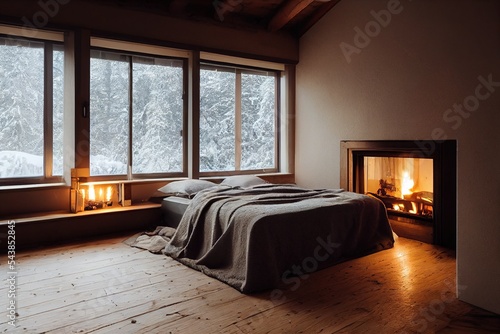 © Ecleposs, Obraz premium Cozy warm apartment bedroom Interior in winter 3D illustration with copy space