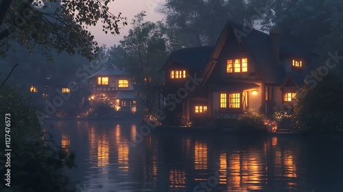 © Saymuna, Fototapeta premium Cozy waterfront houses glowing warmly at twilight, mist on calm water.