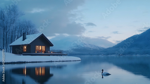 © Nadiyah, Fototapeta premium Cozy winter cabin by a lake at dawn