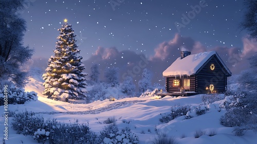 Fototapeta premium Cozy Winter Cabin Christmas Tree Snow