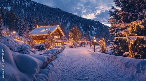 Fototapeta premium Cozy winter cabin illuminated with lights surrounded by snow-covered trees and a serene landscape at twilight in a picturesque mountain setting