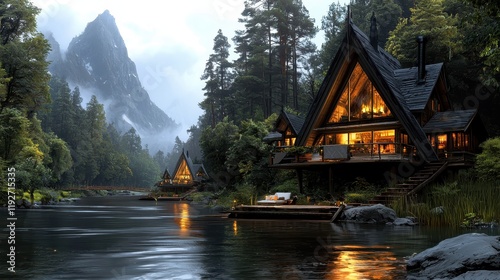 © FarhaStock, Naklejka premium Cozy Winter Cabin in a Magical Forest Near a Serene Mountain Landscape