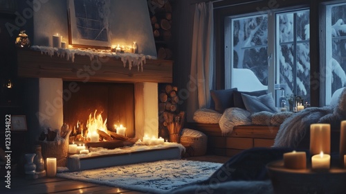 Fototapeta premium Cozy Winter Cabin Interior with Fireplace and Snow Scene