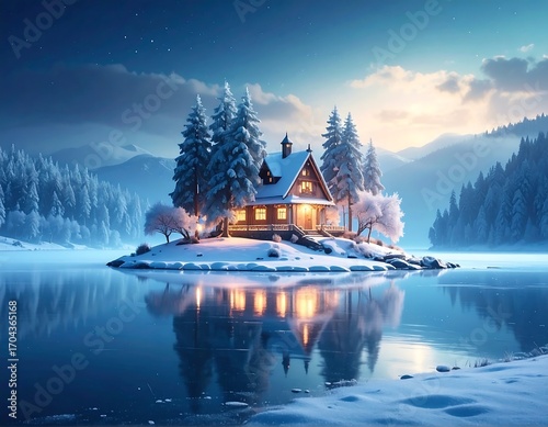 Fototapeta premium Cozy winter cabin on a snowy island