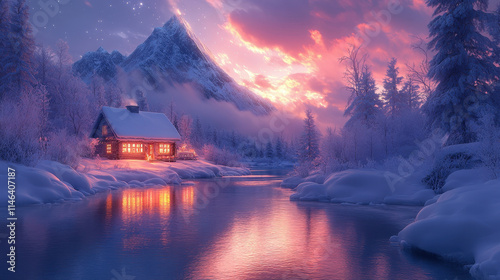 © Bartek, Fototapeta premium Cozy Winter Cottage Under Majestic Aurora with Snow-Covered Landscape at Polar Night