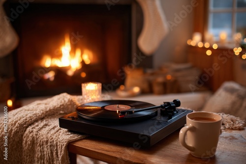 © Iryna, Naklejka premium Cozy winter evening with vinyl record player by fireplace