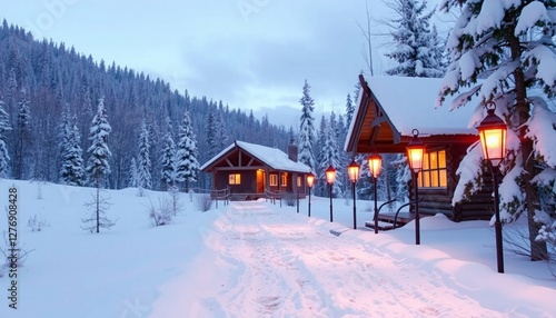 Fototapeta premium Cozy winter landscape with snow covered cabins in a mountain forest at night. Warm glowing lights illuminate the cold, serene holiday scene with rustic houses.