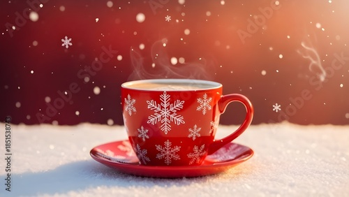 © Md Nurullah , Fototapeta premium Cozy winter morning with snowflakes and hot beverage in red cup