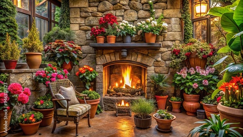 Fototapeta premium Cozy winter scene featuring a crackling stone fireplace surrounded by vibrant potted flowers and lush greenery, warm lighting casting a comforting ambiance.