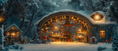 Obraz premium Cozy winter scene featuring a decorated workshop amidst falling snow and...