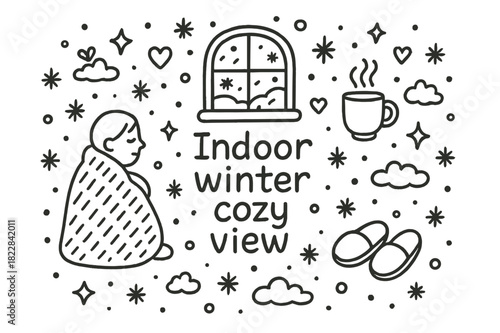 Obraz premium Cozy Winter Scene. Indoor winter cozy view. Hand-drawn doodle illustration of Indoor winter cozy view. person,
