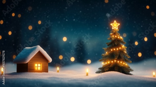 © จิดาภา มีรีวี, Fototapeta premium Cozy winter scene with a decorated Christmas tree and cabin