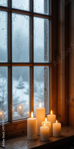 Naklejka premium Cozy winter scene with candles by a frosted window.