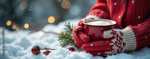 © Nimman, Fototapeta premium Cozy winter scene with knitted sweaters, mittens, and mugs of hot chocolate, perfect for winter holiday labels and branding , christmas, season