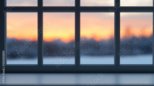 Fototapeta premium Cozy winter sunset view through a frosted window, serene and peaceful...
