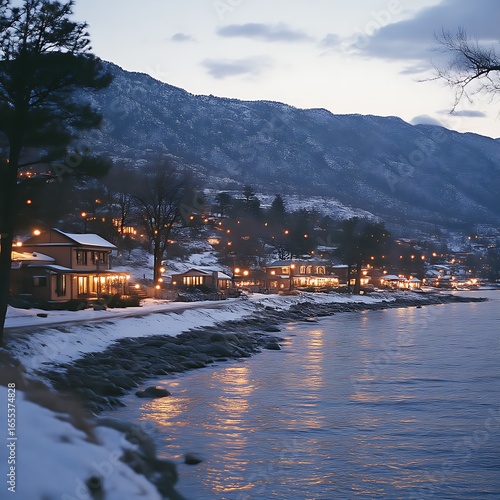 Fototapeta premium Cozy winter village by the lake at twilight.