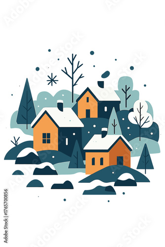 © icon_art, Naklejka premium Cozy winter village landscape with snow covered houses and evergreen trees