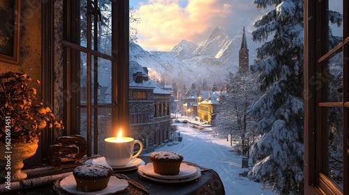 © almeera, Obraz premium Cozy winter window view of snowy mountain village