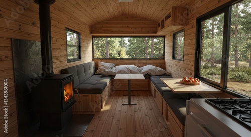 © Suska, Fototapeta premium Cozy Wood Cabin Interior with Fireplace and Forest View