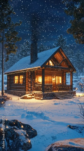 Fototapeta premium Cozy Wooden Cabin in a Snowy Landscape at Night