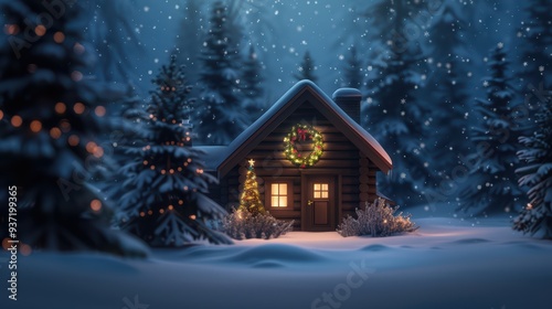 Naklejka premium Cozy Wooden Cabin in Snowy Forest with Christmas Decorations and Falling...