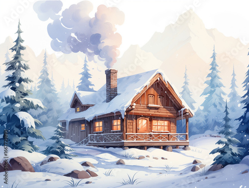 Naklejka premium Cozy wooden cabin in snowy mountain forest