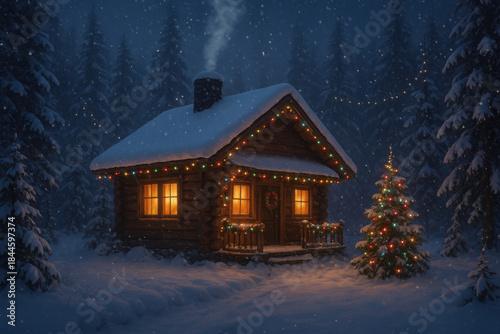 Naklejka premium Cozy Wooden Cabin in Snowy Winter Forest with Warm Christmas Lights and Decorated Tree