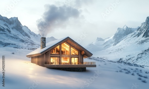 Fototapeta premium Cozy wooden cabin in the snowy mountains, warm lights glowing inside, smoke...