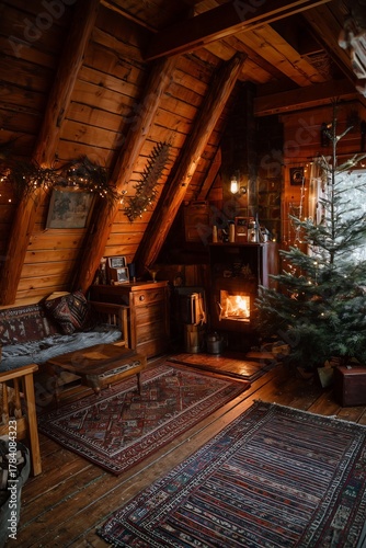 Naklejka premium Cozy wooden cabin interior with fire in the stove, Christmas tree and large...